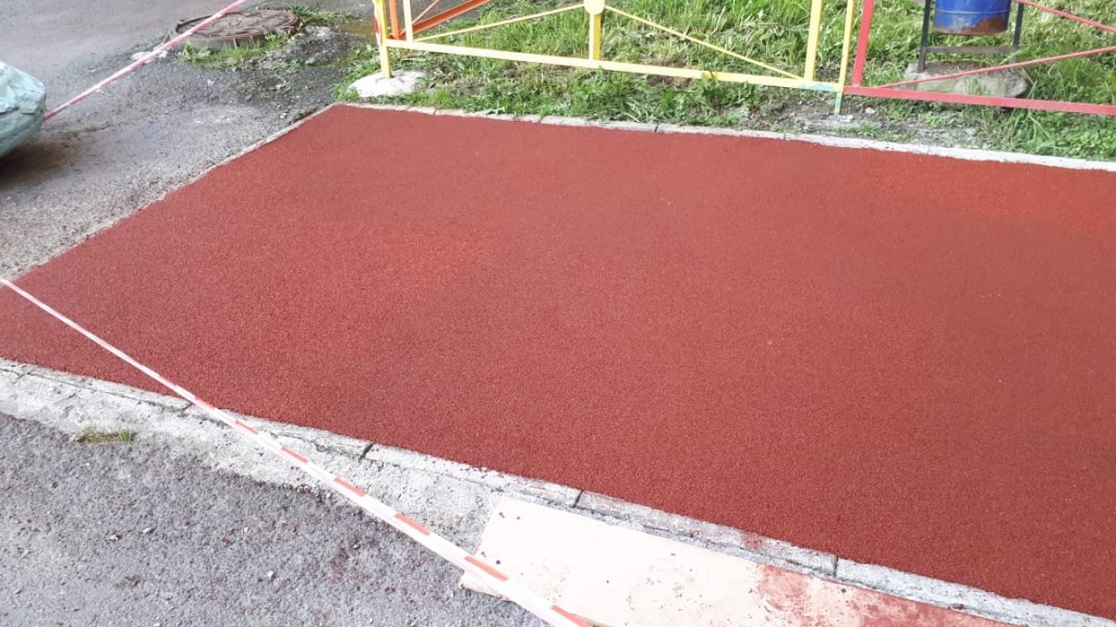 Смесь наносить на праймер, пока он липкий. При нанесении резиновая крошка прилипает к поверхности.