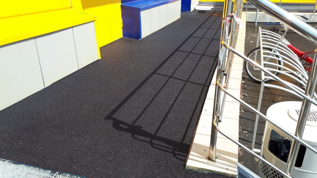 Равномерно распределить полученную смесь клея и крошки по поверхности ручным способом: разложить смесь терками или правилами, придавить катками или c помощью укладочной машины.